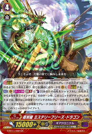 In other decks, Time Leap can utilize this quite well. Striding into this before or after a Groovy turn will obviously do some damage, given that you hit at least a Grade 0 or Grade 1. Chronofang will love this, being an additional card that can Quaddrive alongside Chronofang. It also fuels bind quite nicely and can help Nani hit numbers, flesh out boards with newly bound superior callers, etc etc. ZTB doesn't get as much benefit from this as the other Gears decks do, but since the deck inherently doesn't Counterblast much it can go into Mystery-freeze without overextending.