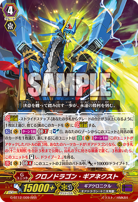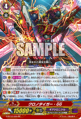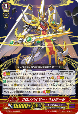 [Stride]-Stride Step-[Choose one or more cards with the sum of their grades being 3 or greater from your hand, and discard them] Stride this card on your (VC) from face down.[ACT](VC)[1/Turn] Generation Break 2:[Soul Blast (1) & Choose a face down card from your G zone with the same card name as this unit, and turn it face up] This unit gets "[AUTO](VC)[1/Turn]:At the end of the battle that this unit attacked, if you have a <Gear Dragon> heart card, reveal up to three <Zodiac Time Beast> from your hand or (RC) in total, and put them on the bottom of your deck in any order. If you put three cards, [Stand] this unit, and it gets drive-2."