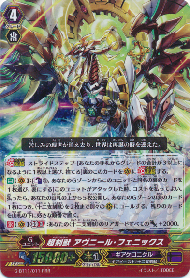 DeleteOn your first stride, you typically want to Time Leap a Grade 1 in hand with Jet G's stride skill into Farm Peacock. Proceed to use Split Pegasus to turn Farm Peacock into 2 Transit Dragons, 2 Nepadas, or 1 of each depending on the situation. Since Peacock was called by Time Leap, he does not return to the deck.